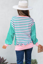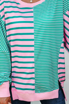 Green Stripe Mix Pattern Color Block Patchwork Side Slit Baggy Sweatshirt